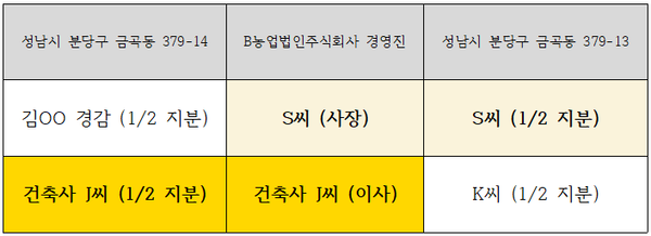 김 전 경감과 J씨가 사들인 땅은 금곡동 379-2번지에서 2019년 5월 24일 1,490㎡씩 379-13, 379-14번지 두 필지로 나뉘어 2019년 6월 12일 판매된 땅이다. 김 전 경감과 J씨의 땅에 바로 인접한 금곡동 379-13번지는 S씨 외 1인이 29억9,000만원에 사들인 것으로 확인됐다. 등기부상 땅 주인 S씨는 김 전 경감 땅의 공동소유주인 J씨와 농업법인주식회사 B사에서 각각 대표와 이사를 맡고 있다.
