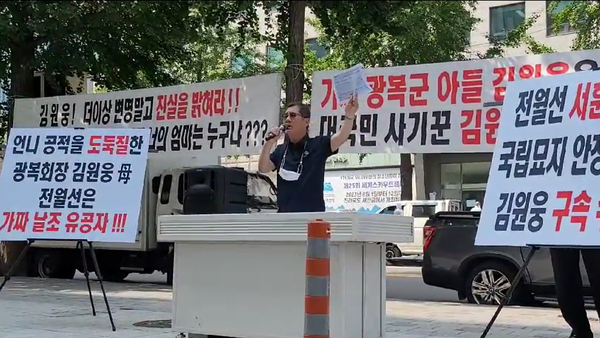 24일 오전 10시 서울 여의도 광복회관 앞에서 광복회개혁모임, 광복회정상화추진본부가 김원웅 광복회장의 사퇴를 촉구하는 기자회견을 열었다. 이문형 광복회개혁모임 대표는 기자회견에서 "김원웅 모친은 가짜 유공자"라고 주장했다. (사진=뉴스버스)