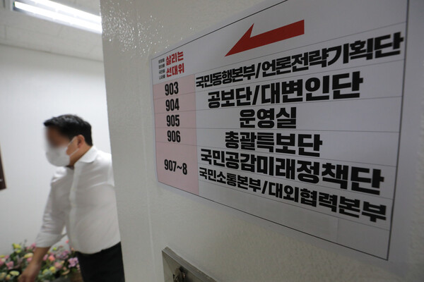 국민의힘 선대본부가 18일 무속인 고문이 활동한 것으로 알려진 산하 네트워크본부 해산을 발표한 직후 안내판에서 네트워크본부 명칭이 가려져 사라졌다.