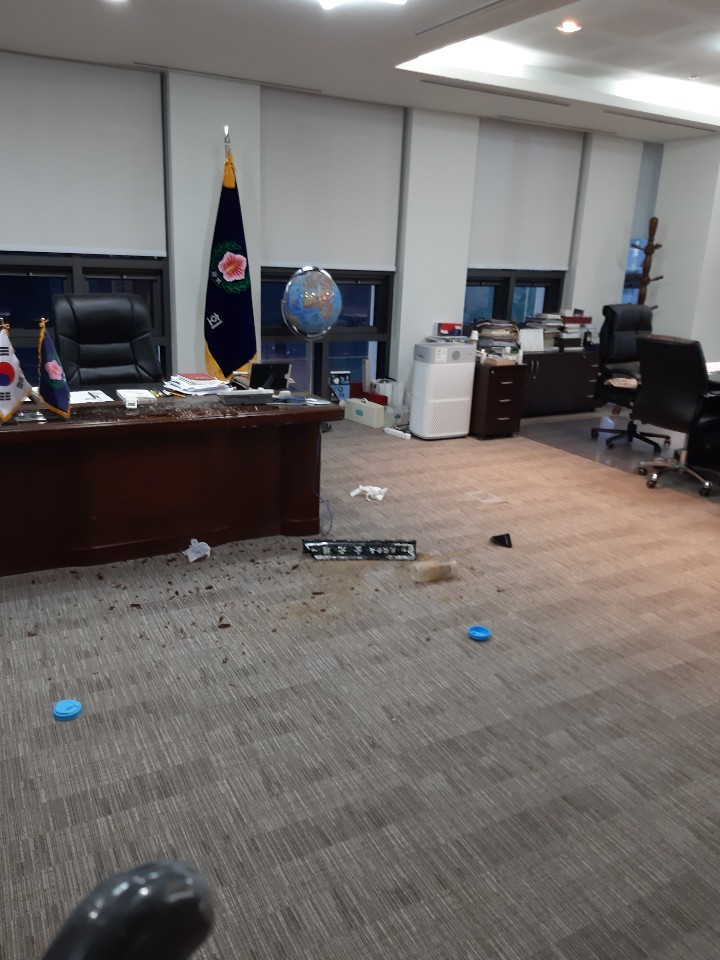 김원웅 광복회장 부모의 허위 공훈 의혹을 제기해온 광복회 내 개혁모임 회원들이 28일 오후 서울 여의도 광복회관의 회장실에 들어가 책상 등에 오물을 투척했다. 광개모 회원들은 김 회장의 사퇴와 사과를 촉구하러 갔으나 김 회장은 자리에 없었다. (사진 광복회 개혁모임)