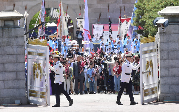 윤석열 대통령 취임식과 동시에 10일 청와대 정문이 활짝 열리고 있다. 1948년 대한민국 정부 수립 이후 74년만에 청와대가 전면 개방됐다.