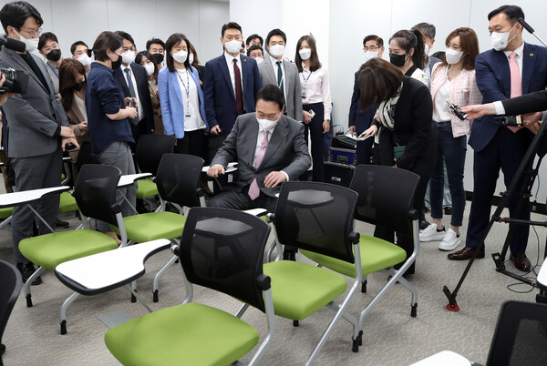 윤 대통령은 브리핑 룸에서 의자에 앉아 보고 “내가 앉으니 작네”라고 해 취재진들의 웃음을 자아냈다.