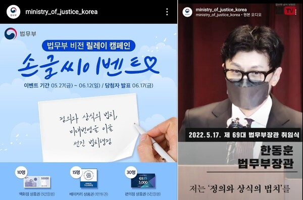 법무부가 한동훈 법무부 장관 취임사를 손글씨로 써서 인스타그램에 올리면 상품권을 주는 이벤트를 열었다가, 한 장관에 대한 '과잉 충성'이라는 지적이 일자 중단했다.
