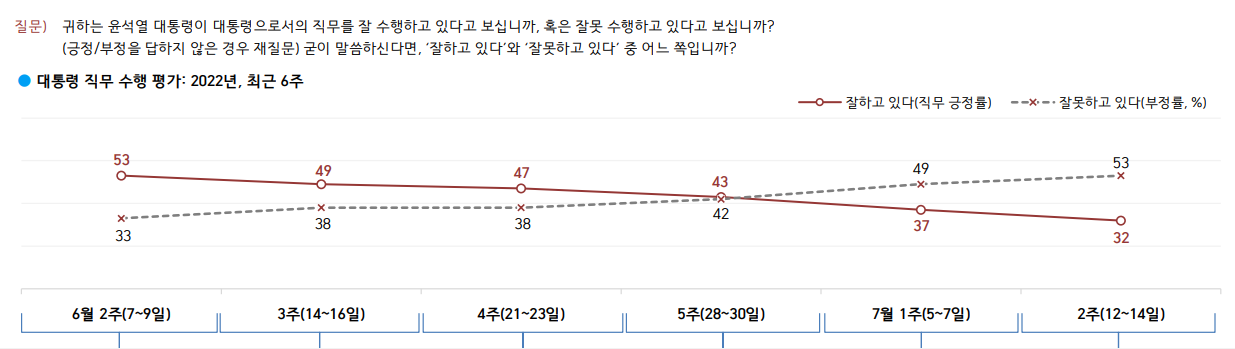 윤 대통령 지지율은 최근 6주간 지속적으로 하락하고 있다. 한국갤럽 조사를 기준으로 6월 2주차 53%였던 윤 대통령 지지율은 6월 3주차 49%, 6월 4주차 47%, 6월 5주차 43%, 7월 1주차 37%, 7월 2주차 32%까지 하락했다. 6주새 국민 21%가 윤 대통령에게 등을 돌린 것이다.