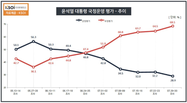 KSOI조사, 尹 국정수행 긍정 28.9% VS 부정 68.5%