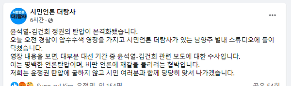 더 탐사측은 이날 오후엔 “시민들과 함께 언론 탄압에 당당히 맞서 싸울 것”이라며 “윤석열 정권은 비판 언론에 대한 재갈 물리기를 멈추고 추락하는 지지율이 의미하는 바가 무엇인지 고민해보기 바란다”는 입장문을 냈다.