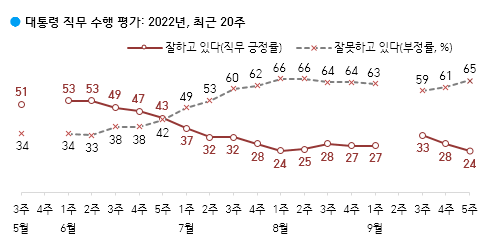 여론조사기관 한국갤럽이 지난 27~29일(9월5주차) 전국 성인 1,000명을 대상으로 조사한 결과, 윤 대통령이 직무수행을 ‘잘 하고 있다’는 긍정 평가는 24%였으며. ‘잘 못하고 있다’는 부정 평가는 65%로 나타났다. 한 주전 같은 조사 때 보다 긍정 평가는 4%p가 떨어지고, 부정평가는 4%p가 많아졌다.