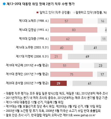 갤럽이 역대 대통령들의 취임 첫해 2분기 직무 수행 긍정률을 비교한 결과, 윤 대통령은 역대 대통령 가운데 하위에서 두 번째인 29%(2022년 7~9월 평균)로 나타났다. 역대 대통령들은 제13대 노태우 57%(1988년 6월), 제14대 김영삼 83%(1993년 6월), 제15대 김대중 62%(1998년 6월), 제16대 노무현 40%(2003년 5월 31일), 제17대 이명박 21%(2008년 5월 31일), 제18대 박근혜 51%(2013년 4~6월 평균), 제19대 문재인 75%(2017년 7~9월 평균) 등이었다.