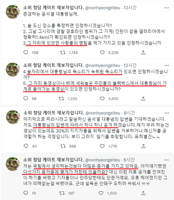 A씨는 6일 자신의 트위터를 통해 윤 대통령에게 ‘술 자리 장소 특정’ ‘술자리 당시 경호라인 범위’ ‘술자리 참석자의 명함’ ‘술자리에서 녹취된 윤 대통령의 목소리’ ‘윤 대통령이 술집에 들어가는 동영상’ 등이 있으면 술자리 참석을 인정하겠느냐고 질문했다.