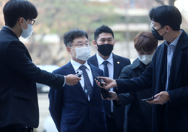 서울중앙지법 형사합의22부(이준철 부장판사) 심리로 열린 이날 재판에 출석하기 위해 법정으로 가던 중 '천화동인 1호는 누구 것인가' 를 묻는 기자들의 질문에 아무런 답변을 하지 않았다.
