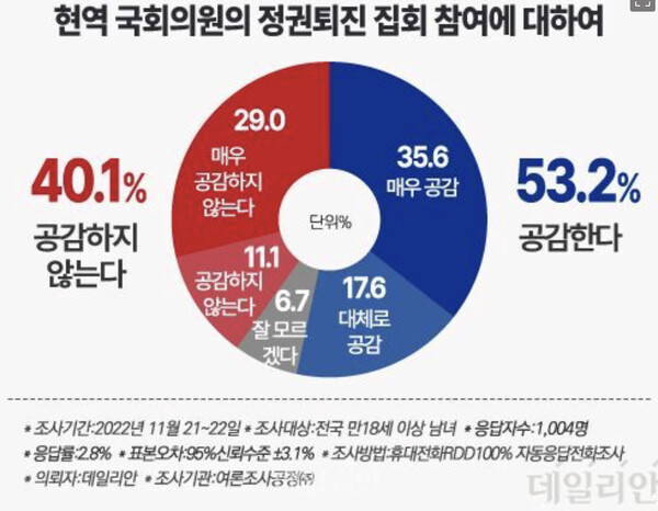 그렇다면 윤 대통령을 ‘매우 부정평가한다’는 여론은 얼마 만큼의 강도로 부정평가를 하고 있을까. 마침 윤 대통령 퇴진 주장에 관련한 여론조사 결과가 나왔다. 데일리안이 여론조사 전문기관 여론조사공정㈜에 의뢰해 11월 21일부터 22일까지 전국 만 18세 이상 1,004명을 대상으로 물었다(100% 무선 자동응답 전화조사, 응답률 2.8%, 표본오차는 표본오차는 표본오차는 95% 신뢰수준에 ±2.0%포인트)
