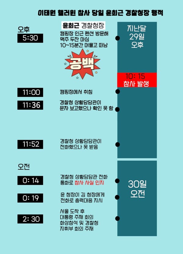 윤 청장이 참사 당일 대규모 집회 시위를 비롯, 대규모 인파 운집이 예상된 핼러윈 축제까지 예정된 상태에서 서울을 떠나 지방에 가 있던 상황이 적절했는지를 따지기 위해선 윤 청장의 당일 행적이 당연히 수사대상이 되어야 한다.