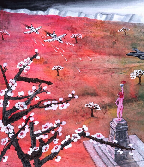 고영미는 색채와 형식에 구애 받지 않는 민화의 자유분방한 양식을 차용해 한지에 채색으로 작업하였다. 색채가 들어간 산수 풍경에 전투기와 나체 여인이 등장하는 게 그런 특징을 잡고 표현한 것이다.