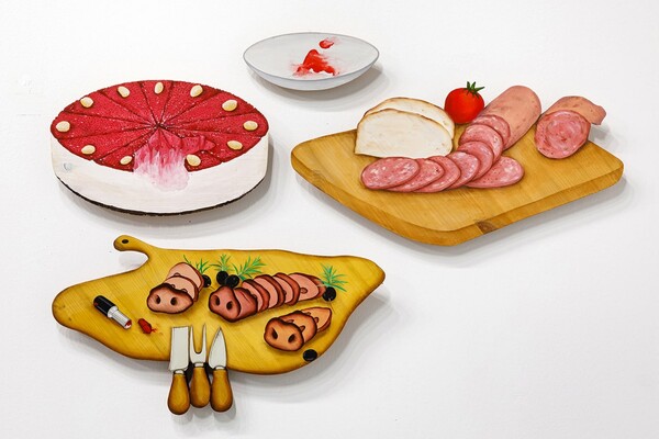 제법 격식을 갖춘 레스토랑에서 볼법한 화려한 요리, 먹다 남은 흔적의 접시, 꽃병, 먹음직한 디저트와 음료, 잔들은 겉모양을 딴 우드 조각에 채색되어 입체(부조)로 제작되고 오브제가 되어 벽면에 설치된다.