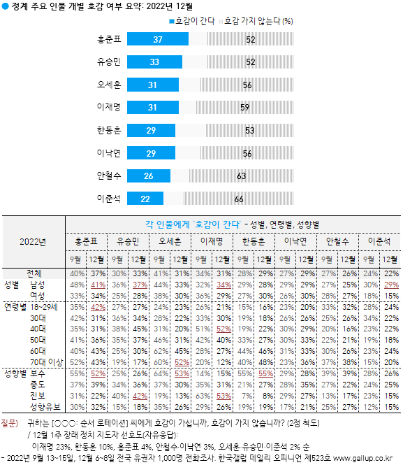이번 한국갤럽 여론조사는 또 하나의 착각을 박살내기도 했다. 여권 인사들 사이에 돌던 ‘MZ세대에게 소구력있는 인사는 한동훈이다’가 그것이다. 여야 대선 주자 8명(홍준표, 유승민, 오세훈, 이재명, 한동훈, 이낙연, 안철수, 이준석) 각각을 두고 응답자들에게 ‘호감’인지 ‘비호감’인지 물었다. 한동훈 법무부장관의 호감도는 29%, 비호감도는 53%였다. 호감도는 다섯 번째로 높았고, 비호감도는 세 번째로 낮았기 때문에 상대평가에선 그리 나쁘지만은 않다.