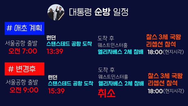 윤 대통령 부부는 '지각 출발'을 하면서 엘리자베스 2세 여왕을 조문하지 못했다. 대통령실이 해외순방 일정을 위해 출발 나흘 전 출입기자들과 비공개 논의를 할 때만해도 윤 대통령의 서울공항 출발 시간은 오전 7시였으나, 실제 출발은 오전 9시였다.