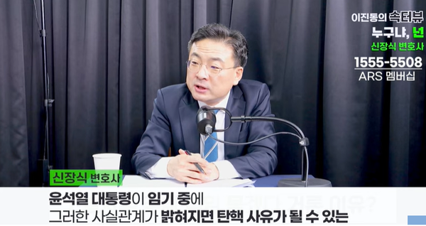28일 뉴스버스TV <이진동의 속터뷰, 누구냐 넌> 방송에 따르면 신 변호사는 당시 검찰총장 으로서 윤 대통령이 지시 의혹을 받는 것과 관련, "특검이 불가피하다"면서 “의혹을 제기하는 부분들이 일부라도 정말 사실로 드러난다면 윤 대통령 탄핵 사유가 될 만한 사안이다”고 말했다.
