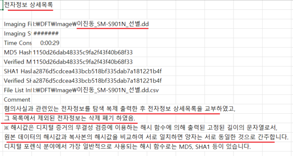 이 삭제‧폐기 확인서를 주기 전에 검찰은 압수한 전자정보의 상세 목록을 엑세파일로 교부하는데, 여기에도 대상은 선별 이미지(선별된 전자정보 복제본 파일)로 나와 있다. 그리고 압수대상으로 선별되지 않은 ‘목록에서 제외된 전자 정보’는 삭제‧폐기했다고 명기돼 있다.