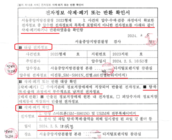 지난 2월 5일 서울중앙지검이 휴대전화 전체 정보 중 압수할 대상을 선별한 뒤 교부한 삭제‧폐기 확인서에 따르면 “압수한 전자정보의 목록에 포함되지 않은 전자정보를 아래와 같이 삭제 폐기하였거나 반환하였음을 확인한다”고 돼 있다.(아래 사진)