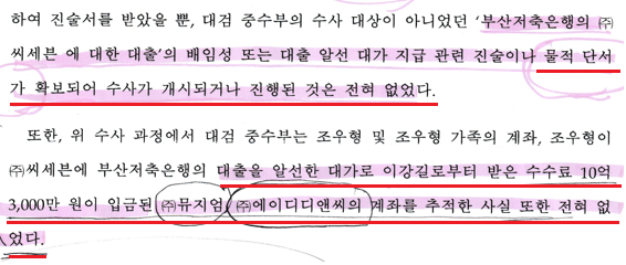 따라서 2011년 대검 중수부 부산저축은행비리 수사팀은 대장동 사업자와 부산저축은행간 대출약정서를 제출받았기 때문에 ‘대출 알선 비리’ 수사를 진행할 ‘물적 단서’가 있었지만 결과는 대장동 사업 대출 수사를 하지 않고 눈감아 버린 것이다.