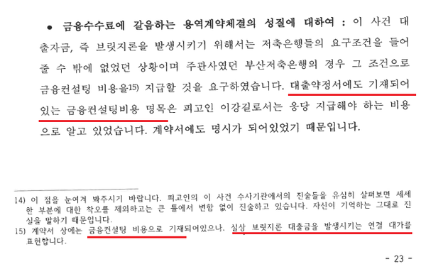 이 씨의 변호인은 이 의견서에서 ‘금융컨설팅 비용’과 관련 “계약서 상에는 금융컨설팅 비용으로 기재되어 있으나 실상 브릿지론 대출금을 발생시키는 연결 대가를 표현한다”고 주석까지 달아놨다.