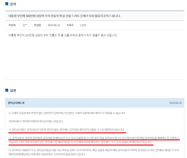 지난 11일 "대통령 영부인께 300만원 상당 명품백을 선물하려 한다. 대통령의 지위를 이용하지 않을 예정이지만 영부인의 지위를 좀 이용하고 싶은데 법에 저촉되는지 궁금하다"는 질의에도, 권익위는 "청탁금지법은 공직자 등의 직무와 관련이 없는 경우에는 공직자 등 배우자의 금품 등 수수를 제한하지 않는다"고 답했다.
