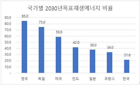 지난달 정부가 발표한 11차 전력수급계획에서 2030년 재생에너지 공급 목표는 21.6%였다. 2030년까지 재생에너지 비율을 3배로 늘리겠다고 약속해놓고, 2년 전 계획과 똑같은 수준이었다. OECD 37개국이 제시한 2030 재생에너지 공급 목표중 꼴찌다.