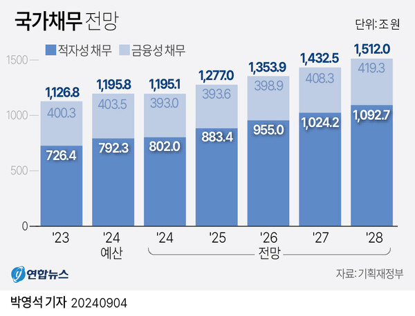 대응 자산이 있어 상대적으로 위험 분산이 가능한 금융성 채무는 올해 393조원에서 내년 393조6,000억원으로 0.2% 증가하는 데 그친다. 국가채무에서 금융성 채무 비중도 올해 32.9%, 내년 30.8%, 2028년 27.7%로 낮아질 전망이다. 국고채로 발생하는 이자 지출도 향후 4년간 연평균 10%씩 늘어날 것으로 예상된다.