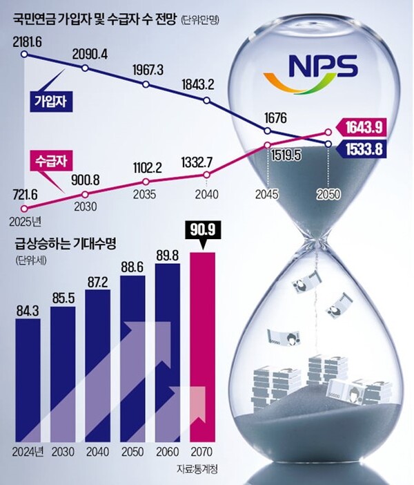 실제 정부 추계를 보면, 국민연금 수급자는 2025년 721만명에서 불과 5년 뒤인 2030년엔 900만명으로 약180만명 늘어나지만, 같은 기간 가입자 수는 2,181만명에서 2,090만명으로 90만명 줄어든다.