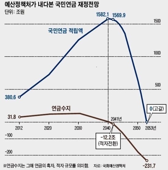 이런 추세가 지속되면 2041년부터 국민연금 지출이 수입을 앞질러 적자로 전환되고, 2056년엔 기금이 완전 고갈된다는 게 정부의 재정추계 결과(국회 예산정책처는 고갈 시기를 2053년으로 예측)다.