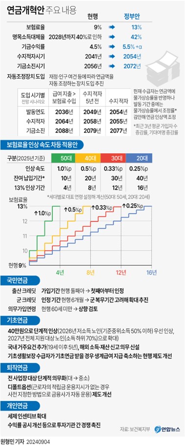 윤석열 대통령이 발표한 연금 개혁안의 핵심은 크게 세 가지다. 출산 여성과 군 복무자에 대한 혜택을 늘리고, 연금 고갈 시점이 빨라지지 않도록 자동안정화장치를 도입하며, 젊은 세대의 부담을 덜어주기 위해 세대별 보험료율 인상을 차등화하겠다는 것이다. 정부는 이를 통해 연금 고갈 시점을 현재 2056년에서 2088년으로 30년가량 연장할 수 있다고 주장한다.