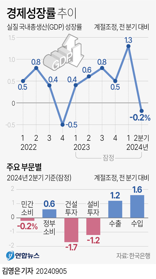 2분기 실질 국내총생산(GDP) 성장률은 전분기 대비 -0.2%로 집계됐다. 우리 경제가 마이너스 성장을 보인 건 2022년 4분기(-0.5%) 이후 6개 분기 만이다.