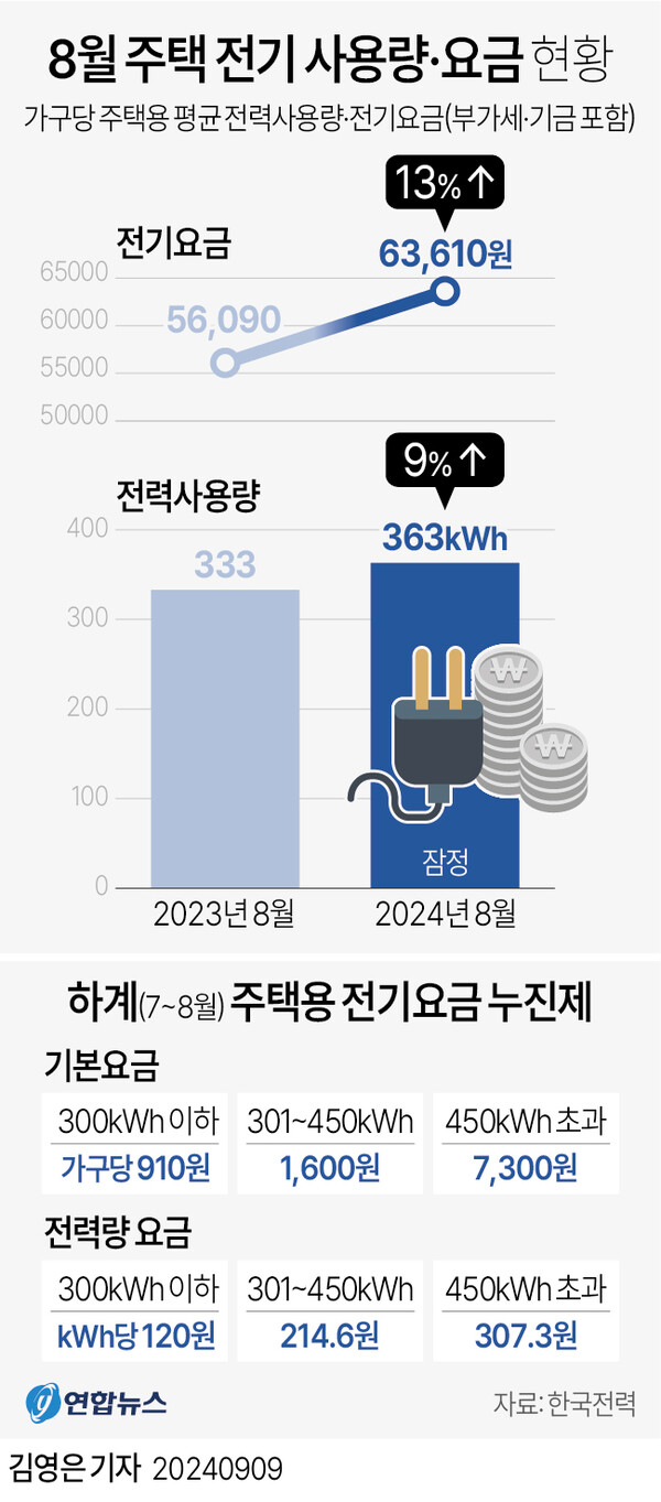 9일 한국전력에 따르면, 지난달 주택용 전기의 가구당 평균 사용량은 363kWh(킬로와트시)로 작년 같은 달보다 9% 증가했다. 이에 따라 8월 평균 주택용 전기요금은 6만3,610원으로 작년보다 13%(7,520원) 오를 전망이다.