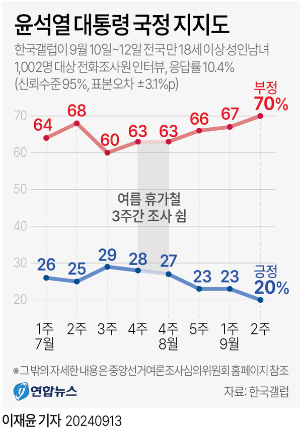 한국갤럽이 지난 10∼12일 전국 만 18세 이상 유권자 1,002명을 대상으로 조사(95% 신뢰수준에 표본오차 ±3.1%포인트)한 결과, 윤 대통령의 직무 수행 긍정 평가율은 직전 조사보다 3%포인트(p) 떨어진 20%, 부정 평가는 3%p 오른 70%로 집계됐다.