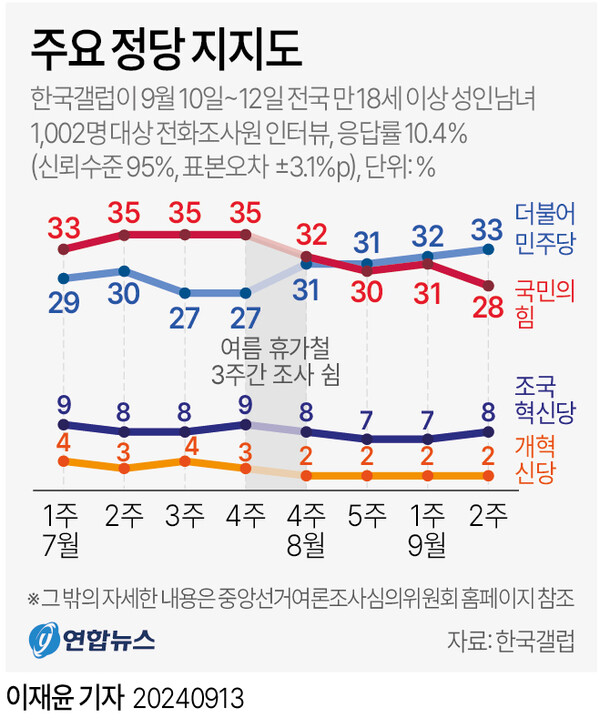 정당지지도...민주 33%, 국힘 28%, 조국혁신당 8%
