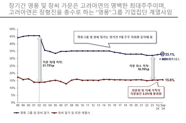 MBK파트너스에 따르면 20여년간 두 가문의 지분은 15%포인트 이상 차이가 났다. 지분 격차는 2002년 31.73%포인트까지 벌어졌고 2022년 이후 최소 격차 16.75%포인트로 줄었으나 최근 다시 영풍과 장씨 일가 측 지분이 늘어나며 격차를 벌리는 중이다. 현재 영풍과 장씨 일가의 고려아연 지분율은 33.1%로 최씨 일가(15.6%)에 비해 2배 이상 많다.