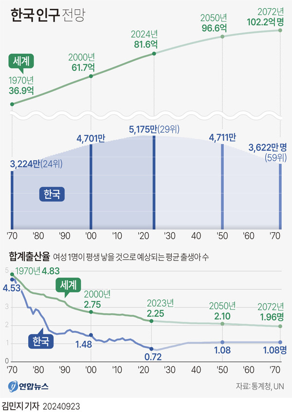 세계 인구는 올해 81억6,000만명에서 2072년 102억2,000만명에 이를 것으로 전망됐다. 같은 기간 우리나라 인구는 5,200만명에서 3,600만명으로 감소할 전망이다. 세계 인구가 25.2% 증가할 때 한국 인구는 30.8% 줄어드는 셈이다.