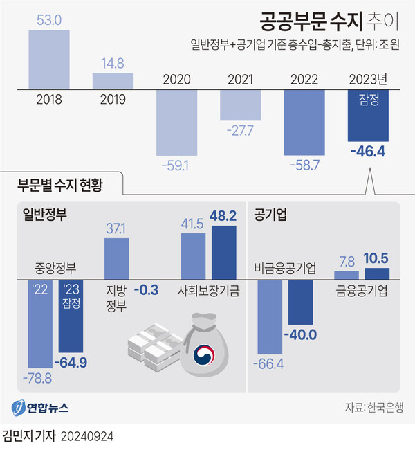 한국은행이 24일 발표한 '2023년 공공부문 계정(잠정)'에 따르면, 지난해 공공부문 수지(총수입-총지출)는 46조4,000억원 적자였다. 전년(58조7,000억원) 대비 적자폭은 12조원가량 축소됐다.