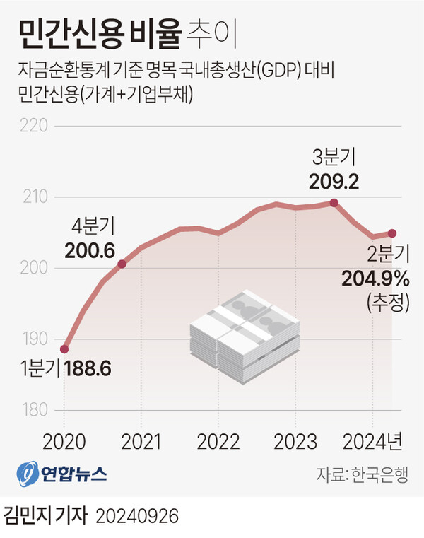 집값 상승과 가계대출이 빠르게 늘면서 가계와 기업 빚을 비롯해 금융 취약성 지표도 반등했다. 우리나라의 민간신용(가계+기업) 레버리지는 올해 2분기말 기준 204.9%로 추정된다. 전분기 204.4%보다 소폭 올랐다. 민간 부문의 빚이 경제 규모의 두 배를 넘는다는 뜻이다. 금융취약성지수(FVI)는 집값 상승과 민간신용 증가 등의 영향으로 1분기 30.0에서 2분기 31.5로 상승했다.