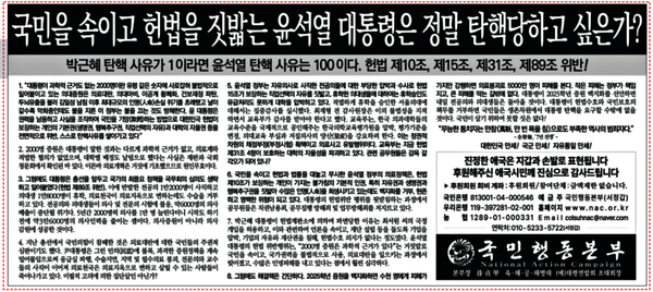 국민행동본부, 조선일보 사설면에 탄핵 경고 광고
