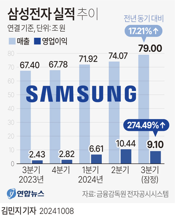 삼성전자는 올해 3분기(7~9월) 연결 기준 영업이익이 9조1,000억원을 기록한 것으로 잠정 집계됐다고 8일 공시했다. 영업이익은 직전 분기 대비 12.84% 줄었으며, 시장 전망치인 10조7,719억원(에프앤가이드)을 15.52% 밑도는 성적이다.