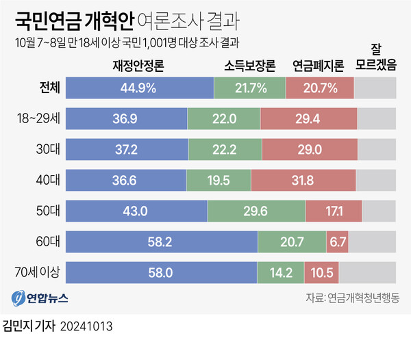 연금 부채 해결을 위한 보험료율 인상과 관련해선 44.2%가 찬성, 40.4%가 반대했다. 연령대로는 만 20대 이하 51.0%가 반대 입장을 보였다. 반대 비율은 만 30대 44.4%, 만 40대 52.3%, 만 50대 42.5%, 만 60대 28.5%, 만 70세 이상 22.0%였다.