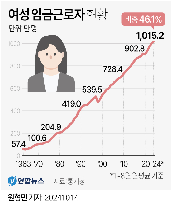 14일 통계청에 따르면 올해 여성 임금근로자는 1,015만2,000명(1~8월 월평균 기준)으로 1963년 관련 통계 작성 이래 처음으로 1,000만명을 웃돌았다. 1963년과 비교하면 17.7배 늘어난 수치다.