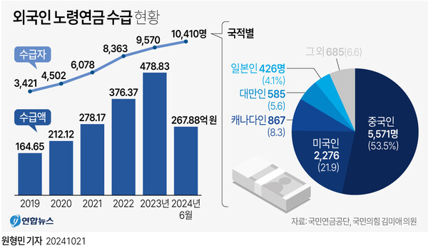 국민연금공단이 21일 김미애 국민의힘 의원에게 제출한 자료에 따르면, 올해 6월말 기준 노령연금을 받고 있는 외국인은 1만410명, 이들에게 상반기 중 지급된 금액은 총 267억8,800만원이었다.