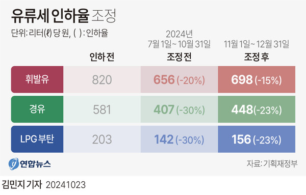23일 기획재정부에 따르면, 유료세 인하폭이 휘발유는 20%에서 15%, 경유는 30%에서 23%, LPG 부탄은 30%에서 23%로 줄어든다. 이에 따라 휘발유 가격은 1ℓ에 42원, 경유는 1ℓ에 41원 오른다. 유류세 인하는 국제유가가 급등했던 2021년 11월 이후 3년째 이어져 이번이 12번째 연장이다.