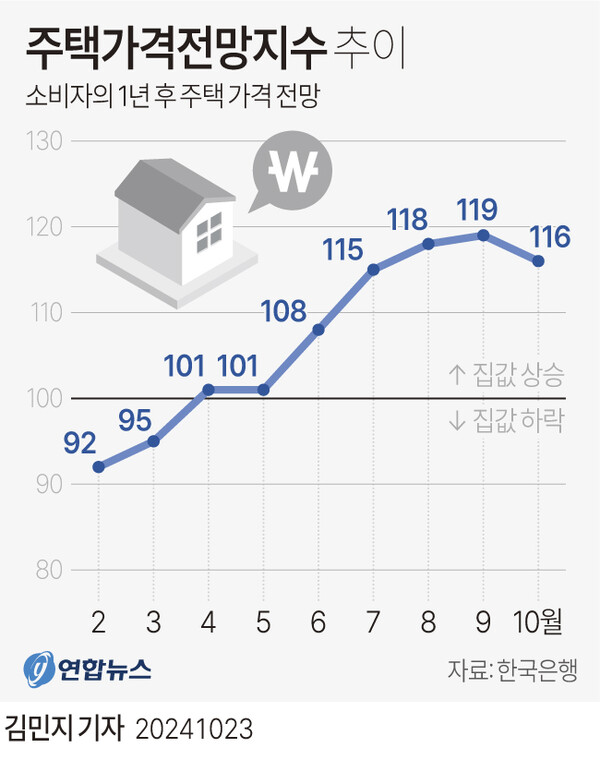한국은행이 23일 내놓은 '소비자동향조사 결과'에 따르면, 10월 주택가격전망지수는 116으로 9월(119)보다 3포인트 떨어져 상승 흐름이 다소 꺾인 모습이다. 9개월 만에 내림세이긴 하지만, 4월(101) 이후 7개월 연속 100선 위에서 움직이고 있어 집값 상승 기대는 여전히 높은 편이다.