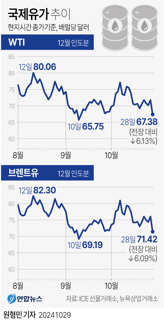 이날 ICE 선물거래소에서 12월 인도분 브렌트유 선물 종가는 배럴당 71.42달러로 전장보다 4.63달러(-6.1%) 내렸다. 뉴욕상업거래소에서 12월 인도분 서부텍사스산 원유(WTI) 종가는 배럴당 67.38달러로 4.40달러(-6.1%) 하락했다. 낙폭은 유가가 하루 새 8% 가까이 폭락한 2022년 7월 12일 이후 2년여 만에 가장 컸다.