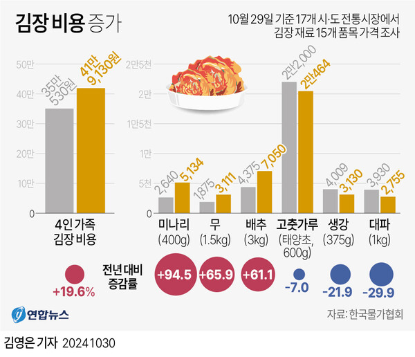 30일 한국물가협회가 17개 시·도 전통시장에서 김장 재료 15개 품목 가격을 조사한 결과, 4인 가족 기준 김장비용이 1년 전보다 20% 늘어난 42만원으로 추산됐다. 대형마트에서 김장재료를 살 경우 52만1,440원으로 10만원가량 더 비쌌다.