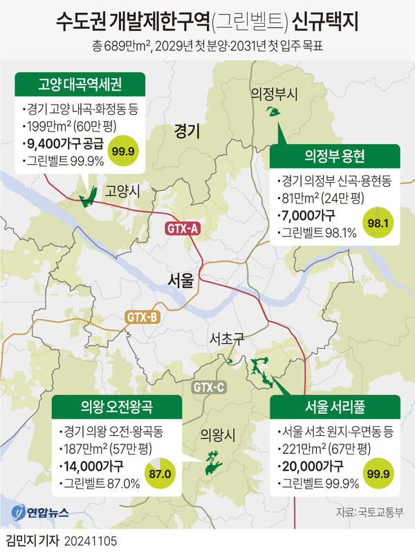 서울 서초와 서울 주변 10㎞ 이내 지역 4곳에 689만㎡(208만평) 신규 택지를 조성해 주택 5만가구를 공급한다. 이를 위해 12년 만에 서울 시내 그린벨트를 해제하는 등 전체 사업의 96.2%를 그린벨트 지역에서 추진한다.