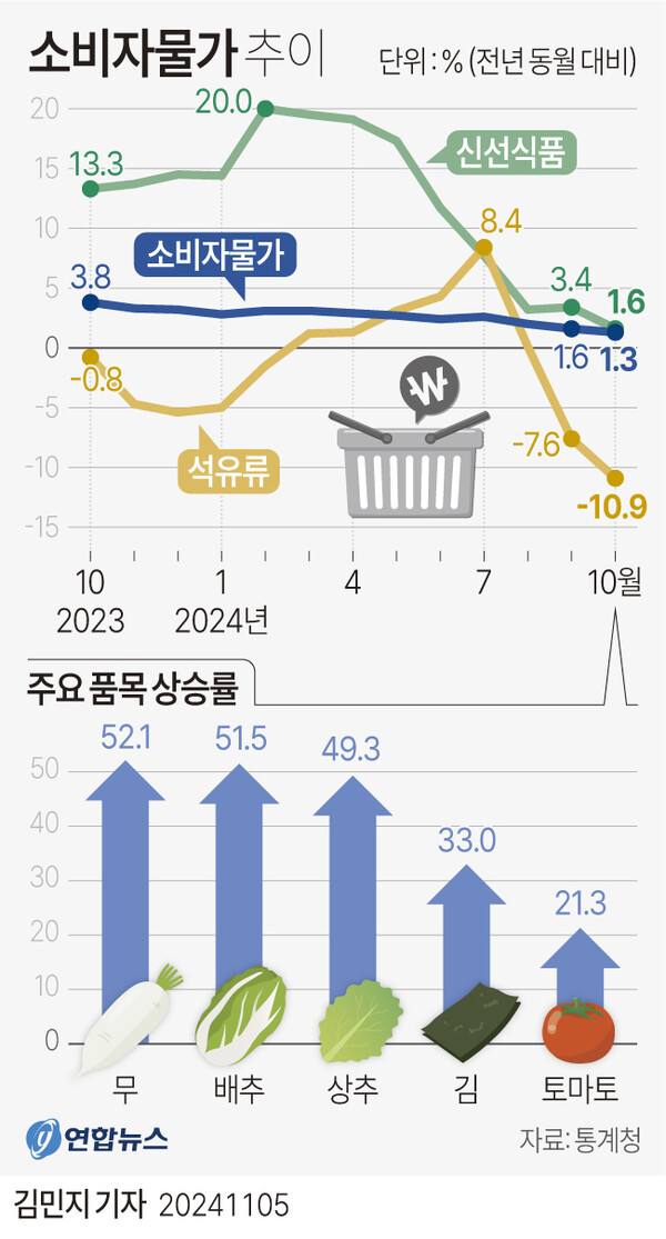 10월 물가상승률 1.3%로 둔화… 배추·무 50%↑ ‘김장 물가'는 불안